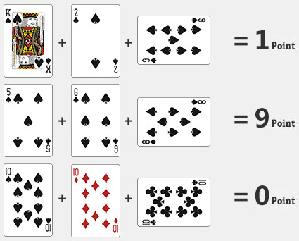 Pemain dan dealer akan menerima dua kad. Semua kad puluhan dan kad bergambar bernilai sifar. Jika nilai kad melebihi 9, maka nilainya akan diselaraskan dengan menolak 10 daripada jumlah keseluruhan.